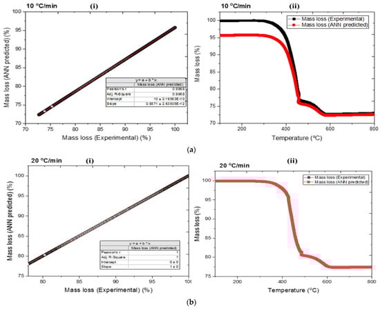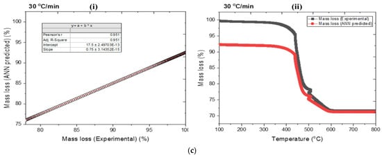 The linear correlation (i) and comparative mass loss thermogram (ii) of predicted PET MP degradation from the ANN and TGA systems at (a) 10 °C/min; (b) 20 °C/min; (c) 30 °C/min.