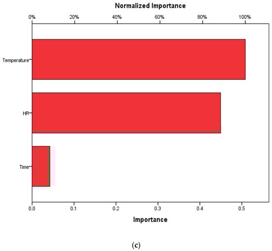 Relative importance of input variable to the ANN prediction of mass loss at heating rate of (a) 10 °C/min; (b) 20 °C/min; (c) 30 °C/min.