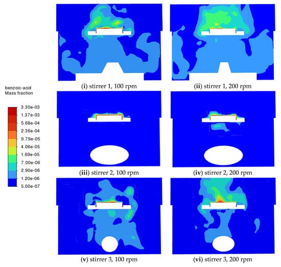 CFD predictions of the benzoic acid mass fraction on the vertical middle cross-section for different stirrers at different rotation speeds (100 rpm and 200 rpm).