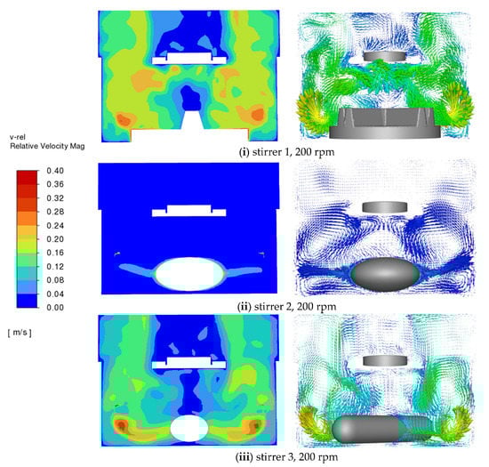 Figure 5 shows the fluid velocity for different stirrers at a stirrer speed of 200 rpm. The velocity magnitude is much higher with stirrers 1 and 3 than with stirrer 2. They range from 0 m/s to 0.4 m/s, which is of the same order of magnitude as in the previous studies conducted by D’Arcy et al. [], Bai and Armenante [,,], and McCarthy et al. []. The complex eddy patterns generated by the stirrers are evident in the vector plot on the right side of the figure. It is also evident that in the region of the tablet the flow is very weak for stirrer 2 and strongest for stirrer 1.