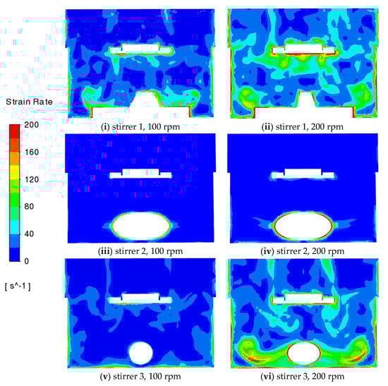 CFD predictions of strain rate on the vertical middle cross-section for different stirrers at different rotation speeds (100 rpm and 200 rpm).