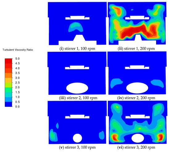 CFD predictions of the turbulent viscosity ratio on the vertical middle cross-section for different stirrers at different rotation speeds (100 rpm and 200 rpm).