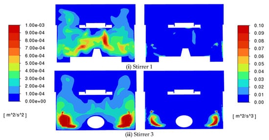 Turbulence kinetic energy (left) and turbulence energy dissipation rate (right) for stirrers 1 and 3 operating at 200 rpm.