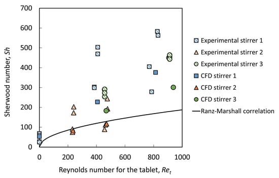 The correlations between the Reynolds number for the tablet and the Sherwood number for both the simulations and experiments with different stirrers are shown in Figure 10. The Sherwood numbers for tablet dissolution are of the same order of magnitude as that for spheres when correlated against the Reynolds number for the tablet. The simulation results show good agreement with the experimental data in that they capture the trends for all configurations. Differences can easily be explained by the fact that the magnetic stirrer in the experiment will not rotate perfectly centered on the axis but tend to wobble, causing improved mixing which is consistent with the excellent agreement in the stationary case. Therefore, the statistical significance of the variations between the experimental and simulation data is not included here.