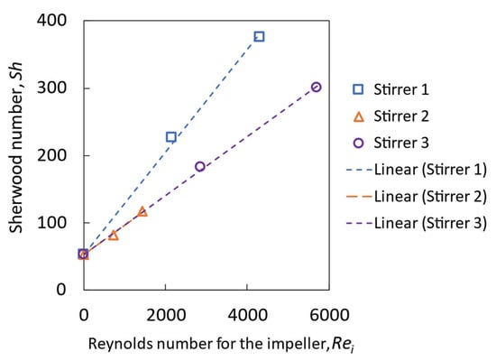 Figure 11 shows the correlation between the Sherwood number and the impeller Reynolds number. It is found that the Sherwood number increases linearly with the increasing impeller Reynolds number for different stirrers, meaning that the mass-transfer coefficient increases linearly with the increased rotational speed in this system with different stirrers. Stirrer 1 performs best, while stirrers 2 and 3 follow the same trend.