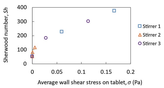 Figure 12 shows the correlation between the Sherwood number and the average wall shear stress on the tablet, which ranges from 0 to 0.2 Pa for different stirrers and different rotational speeds. All data collapse onto a single curve. Typical correlations show that the Sherwood number increases as the wall shear stress increases and this is evident here too.