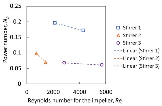 Figure 13 shows the relationship between the power number and impeller Reynolds number for different stirrers and different rotational speeds. With stirrer 2, the Reynolds numbers are smaller than 2000, and the power number decreases with an increase in the Reynolds number showing laminar flow behavior. With stirrer 1, the Reynolds numbers are in the range of 2000 to 4000 and the power number decreases slowly as the Reynolds number increases. With stirrer 3, the Reynolds numbers range from 3000 to 6000 and the power number only changes slightly when the Reynolds number increases. These results are consistent with those expected from compilations of data for many impellers [].