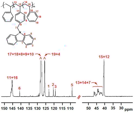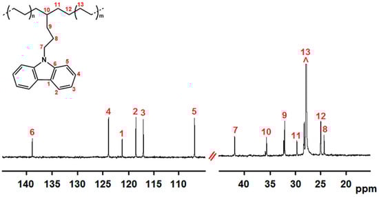 The NMR spectra of the monomers, N-pentenyl-carbazole (PK) and 4-(N-carbazolyl)methyl styrene (SK),were acquired by using a Bruker Advance 400 spectrometer (Bruker, Germany) (1H, 400 MHz; 13C, 100 MHz) operating at 298 K. The samples were prepared by dissolving 5 mg of the monomer in 0.5 mL of deuterated chloroform (CDCl3). The used internal chemical shift reference was tetramethylsilane (TMS). The NMR spectra of P(E-co-PK)s were acquired by using an ASCEND 600 spectrometer (Bruker, Germany) (1H, 600 MHz; 13C, 150 MHz) operating at 373 K. The samples were prepared by dissolving 20 mg of P(E-co-PK) in 0.5 mL of TCDE (tetrachlorodideuteroethane). The used internal chemical shift reference was hexamethyldisiloxane (HMDS). The NMR spectra of P(S-co-SK)s were recorded on an ASCEND 600 spectrometer (1H, 600 MHz; 13C, 150 MHz) operating at 298 K. The samples for the NMR analysis were prepared by dissolving them in 0.5 mL of CDCl3 (deuterated chloroform) and 20 mg of P(S-co-SK). The used internal chemical shift reference was tetramethylsilane (TMS).