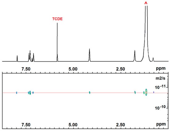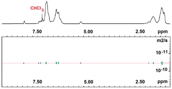 Two-dimensional DOSY NMR experiments were also conducted to demonstrate the successful copolymerization of all of our samples. In Figure 3 and Figure 4, the DOSY maps with the 1H NMR spectra projected on top of run 1 and 3 are depicted. Both show that 1H NMR signals of non-fluorescent comonomer homosequences and fluorescent comonomer isolated units of any copolymer sample present the same diffusion coefficient (2.02 × 10−11 m2/s for P(E-co-PK) and 3.45 × 10−11 m2/s for P(S-co-SK)), according to an efficient copolymerization of the two monomers. These data are consistent with GPC analysis showing monomodal curves for all of the copolymer samples (see Figures S1–S4 in S.I.).