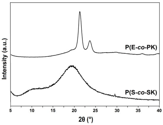In Figure 5, the X-ray diffraction spectra of runs 1 and 3 are reported. The run 1 (P(E-co-PK)) pattern shows two sharp high-intensity diffraction peaks at 2θ values of 21.6° and 23.6° as well as several lower intensity peaks as typically observed in semicrystalline PE samples [36]. Similar to the PS WAXD pattern, [37] run 3 (P(S-co-SK)) reveals at 2θ = 19.5° an intense and broad peak, to be assigned to the amorphous phase, along with a typical so-called “polymerization peak” at 2θ = 10.1°.