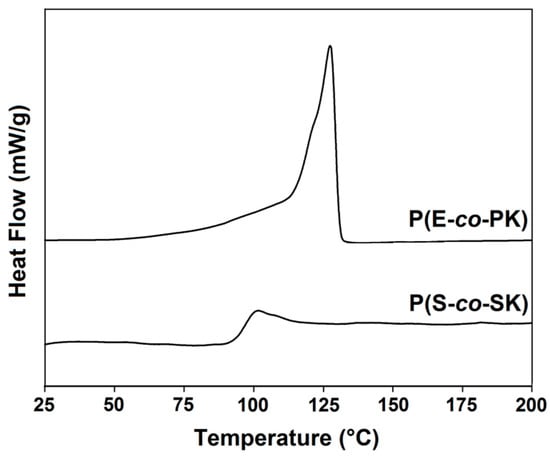 The results of the thermal analysis showed that all of the copolymer samples (P(E-co-PK)s and P(S-co-SK)s) have high decomposition temperatures (see Table 1 and Figures S5–S8 in S.I.), comparable with those of the corresponding homopolymers (PE and PS, respectively). The DSC analysis results of P(E-co-PK) (run 1) and P(S-co-SK) (run 3) are shown in Figure 6. As expected, the P(E-co-PK) thermogram presents an endothermic peak due to PE block melting, while in the P(S-co-SK) thermogram, only a glass transition phenomenon is detected.