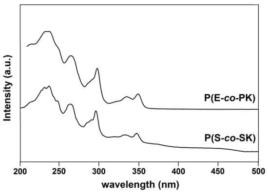 UV-vis absorbance spectra on the films of all of the prepared copolymer samples were carried out. As an example, the run 1 and 3 spectra are reported in Figure 7. Although P(E-co-PK) and P(S-co-SK) copolymers contain a very low amount of PK and SK units, their UV-vis spectra clearly show two peak maxima at ~334 and ~349 nm, which are distinctive of carbazole groups [38,39].