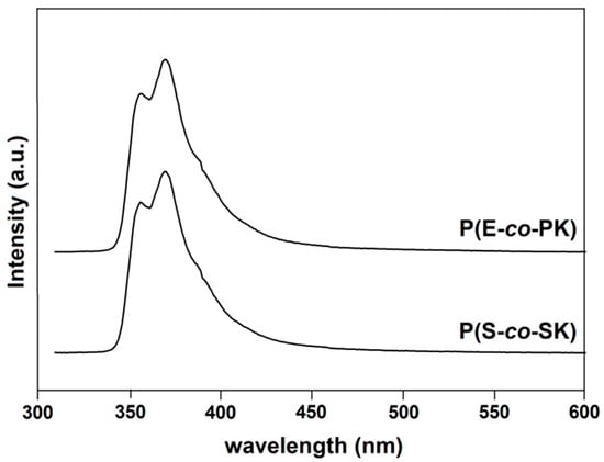 In Figure 10, the fluorescence spectra of the PE/P(E-co-PK) and PS/P(S-co-PS) blend film samples, carried out at room temperature using an excitation wavelength of 300 nm, are depicted. In both spectra, the bands at 351 and 366 nm detected in the P(E-co-PK) and P(S-co-PS) copolymer samples (see Figure 8) attributable to the emission of the carbazole units are still present. Although these results are preliminary, they indicate that our copolymers are suitable for use as fluorescent markers of commercial polymers.
