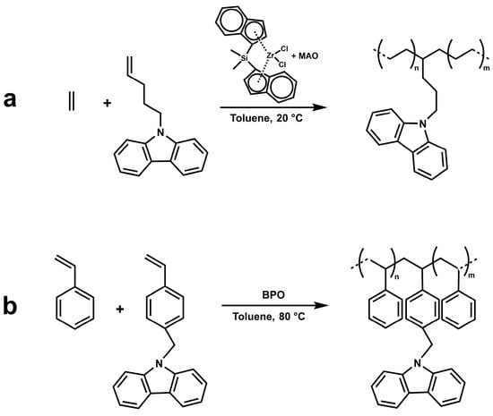 Ethylene-co-N-pentenyl carbazole copolymer samples (P(E-co-PK)s) were synthesized by insertion Ziegler–Natta polymerization [26] using the catalytic system rac-dimethylsilylbis(1-indenyl) zirconium dichloride/MAO (see Scheme 2, path a). Styrene-co-4-(N-carbazolyl)methyl styrene) copolymer samples (P(S-co-SK)s) were instead prepared by free radical polymerization using benzoyl peroxide (BPO) as an initiator (see Scheme 2, path b).