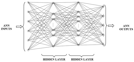 The neurons of the ANN are organized in layers, arranged in a successive order for processing data that starts from the input layer and ends with the output layer. The intermediate layers are called hidden layers. The typical topology of a multilayer ANN is presented in Figure 2.
