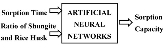 Each of the two designed ANNs were trained with experimental measured data consisting of the values of the sorption capacity determined for 12 intervals of time (multiples of 5 days and ranging from Day 5 to Day 60) and for five mixture values (shungite, shungite and rice husk at ratio of 1:1.7, shungite and rice husk at ratio of 1:4, shungite and rice husk at ratio of 6:1 and the carbonized rice husk alone).