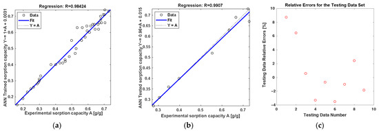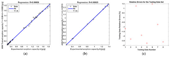 The first ANN was trained to model the sorption capacity of the 10% contaminated soil (Table 1). The results presented in Figure 4a show the regression plots for the training data and Figure 4b shows the testing data subsets. The relative errors for the testing data subset are presented in Figure 4c.