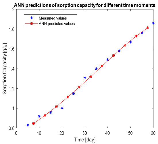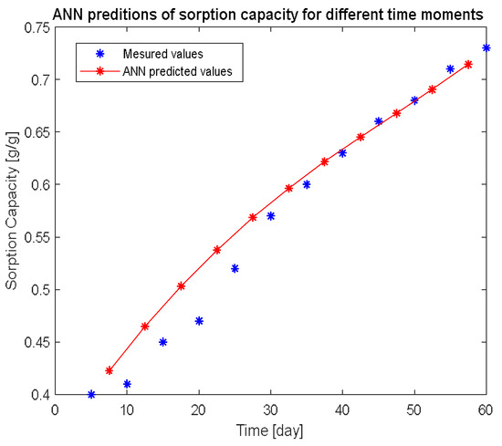 As a second evidence of the prediction capability, the secondly designed and trained ANN was used to predict the sorption capacity of the 15% oil-contaminated soil for a mixture of shungite and rice husk at a ratio of 6:1, but at different time instances. The new considered time intervals were: 7.5 d, 12.5 d, 17.5 d, 22.5 d, 27.5 d, 32.5 d, 37.5 d, 42.5 d, 47.5 d, 52.5 d and 57.5 d. The results of the predictions are presented in Figure 8 where the measured values are shown with blue dots and ANN predicted values with line-connected red dots.