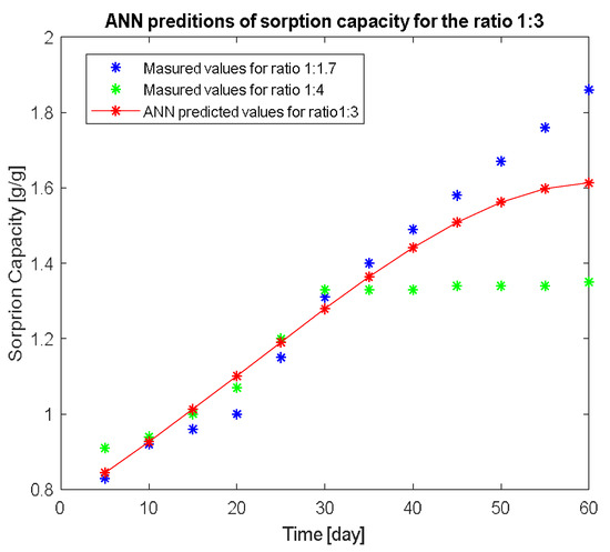 The same ANN was used to predict the sorption capacity of the 10% oil-contaminated soil, but for the mixture of shungite and rice husk new ratio value of 1:3. This shungite and rice husk ratio of 1:3 was situated between the 1:1.7 and 1:4 experimental ratios. For the latter values of the ratios, the sorption capacity was experimentally determined. The results of the predictions are presented in Figure 7 where the measured values are shown with blue dots for the ratio 1:1.7, with green dots for the ratio 1:4 and for the ANN predicted values with line-connected red dots.
