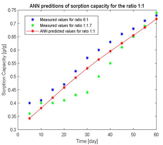 This second trained ANN was also used to predict the sorption capacity of the 15% oil-contaminated soil for the mixture of shungite and rice husk at a new ratio of 1:1. The shungite and rice husk new ratio of 1:1 was situated between the 6:1 and 1:1.7 ratios. For the latter values of the ratios, the sorption capacity was determined by the experiments. The results of the predictions are presented in Figure 9 where the measured values are shown with blue dots for the ratio 6:1, with green dots for the ratio 1:1.7 and for the ANN predicted values with line-connected red dots.