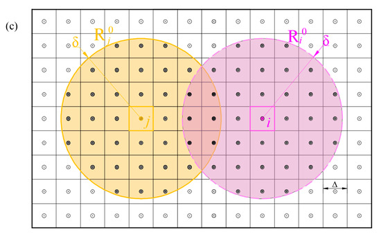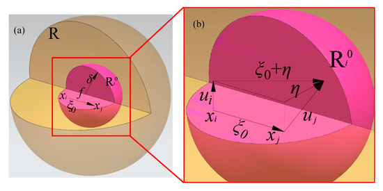 In space and time, each point in an object represents the position of a material point, and each material point occupies a coordinate , a volume and a corresponding material density . Every material point may be changed by the action of physical force, displacement or velocity. In the peridynamic theory, any material point obeys the Lagrange description; that is, in the Cartesian coordinate system, the motion of the object is expressed by describing the spatial position of each material point at different times [28,29,30,31]. Based on the law of universal gravitation, the peridynamic theory can be formed: the motion of each point between any two material points of an object can be described by the interaction force . If the object is discretized into finite material points, certain interaction forces exist among these points, and when the distance between the two material points is more than a certain length , the interaction force between the two material points is zero [16,32]. According to the peridynamic theory, it is assumed that the object occupies a reference domain R, and any material point i in the reference domain has a reference subdomain with a radius of , and there is an interaction force between material point i and any point material point j within the subdomain shown in Figure 1.