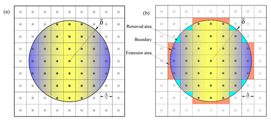 Based on the PD theory, in the process of numerical analysis, the solution to the spatial integral equation is transformed into the solution of the finite sum of the material points [39]. Moreover, we need to consider the interaction between the material points in the reference subdomain . There is another material point satisfying the inequality . Equation (1) can be discretized as follows: