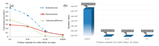 Analysis of calculation accuracy and efficiency: (a) relationship between calculation area and cubic lattice and (b) relationship between iteration times and cubic lattice.