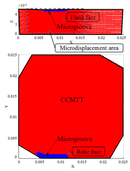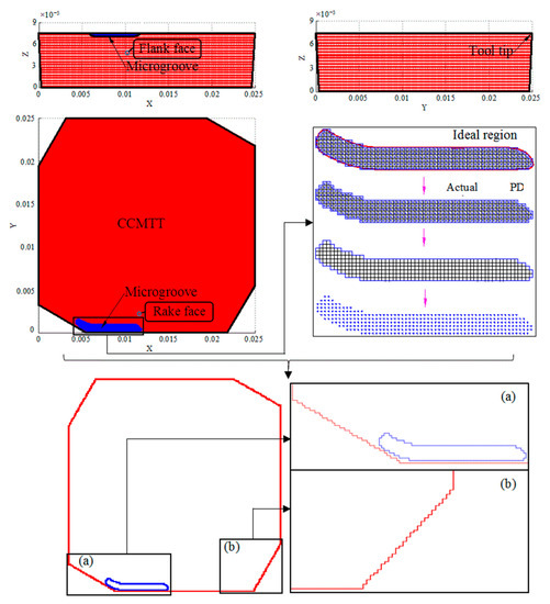 When the peridynamic calculation time t = 0, according to the location sequence number and the volume constant of the cubic lattice of each material point, the spatial position of all material points representing the whole CCMTT is calculated according to Equations (1)–(34). The center hole of the CCMTT has no effect on the analysis results of the near-field of the cutting edge; therefore, its modeling can be ignored to improve the computational efficiency. Then, the PD model of the CCMTT can be established and presented by a data visualization module of MATLAB, as shown in Figure 6. The PD modeling accuracy of the geometric contour of the CCMTT and the microgroove on the rake face can be controlled within and , and the modeling accuracy of the whole CCMTT can be controlled within .