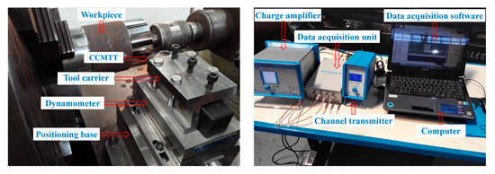 The collection experiment on the impact load was carried out on a CW6163C lathe. By installing a Kistler three-dimensional dynamometer, the experimental platform was set up as shown in Figure 8. The cutting conditions were vc = 115 m/min, f = 0.42 mm/r and ap = 2 mm. The workpiece was oil country tubular goods (OCTG) 40CrMnMo, which is a high-strength alloy steel, as described above. The peak value of the cutting force of the CCMTT in three directions (the main cutting direction, the feed direction and the cutting depth direction) was measured and collected. The experiment was repeated five times, and the arithmetic mean value was taken as the effective data. The tool angles are shown in Table 1, and the mechanical properties of the tool and workpiece materials are shown in Table 2.