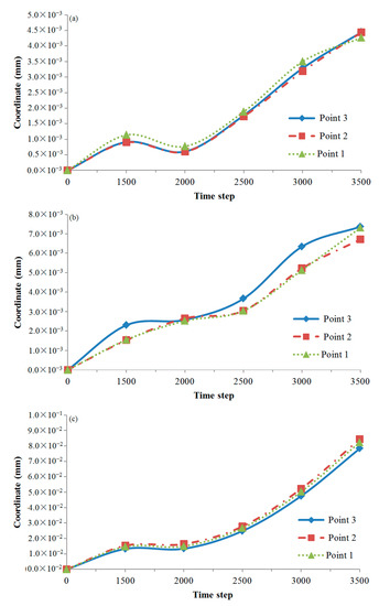 The process of crack generation and propagation is expressed by the displacement of material points in the near-field of the main cutting edge of the turning tool. Therefore, in the whole calculation process, three representative material points were selected from the external load area in the near-field of the cutting edge of the CCMTT to mark and track material point 1 on the main cutting edge, material point 2 on the flank face close to the main cutting edge and material point 3 on the neighboring layer downstream from the rake face adjacent to the main cutting edge. The displacements of three marker points above and near the cutting edge in the Y-direction (cutting depth direction), the Z-direction (main cutting direction) and the X-direction (feed direction) were studied. After data processing, the relationship curves between the displacements of three marked points in three directions and the calculation time steps were obtained after a 3500-time-step PD numerical solution for the CCMTT, as shown in Figure 11.