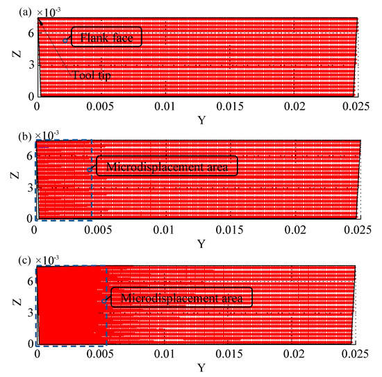 Position evolution in the main cutting direction of material points of the CCMTT: (a) the first step of PD analysis of the CCMTT (initial state), (b) the 2000th step of PD analysis of the CCMTT (microdisplacement), (c) the 3500th step of PD analysis of the CCMTT (further microdisplacement).