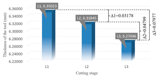 At the same time, a cutting experiment was carried out under the same cutting conditions, and the flank face of the CCMTT was observed and measured. The micromorphology of the flank face and the variation in the tool thickness in the near-field of the cutting edge in three stages are shown in Figure 14.