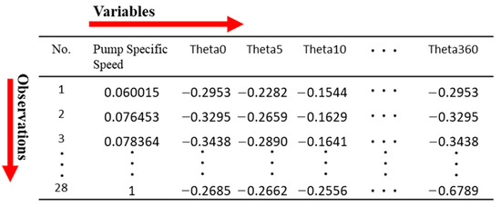 The datasets are sourced from complete experimental characteristic curves compiled and published by Trey et al. [24]. These experiments are designed and performed in a laboratory setting using a test rig and various other apparatuses, such as torque, flow, pressure, and power meters, to measure the rate of change in the pump head and torque of real model pumps. The results of the experiments are plotted on graphs as the pump dimensionless head and torque against theta [9,25,26,27,28,29]. The total number of complete curves selected for the ML experiment is 28, with the specific speeds ranging from 15.7 to 261.6. The data points of a stepwise increment of 5 units of θ are chosen from each respective curve. Given each curve, a total of 28 observations with 74 variables are recorded, as shown in Figure 3. The dataset is then first normalized using the column-wise normalization of the specific speeds by dividing them with the respective absolute maximum to attain a range of 0 to 1 for all data in the specific speed column. The same is carried out for the curve data points (Theta0–Theta360), but they are normalized row-wise. This routine of data preparation is carried out for both the Wh and Wb curves.