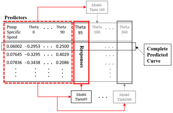 Now, these input data points become the block or pool of datasets that the ML model fetches input data from to generate the datasets of Quadrants I, II, and IV. The normalization of the predicted datasets is reversed, and the dataset is rearranged from theta 0 to 360 and then plotted against the actual curve, as seen in Figure 6. The graph results show that the ML model is able to predict the change in the dimensionless head and torque over theta with great accuracy, recording a maximum RMSE of 0.032. It is also able to significantly differentiate between pumps of the same specific speed. The input data have a fixed maximum variable count of 20, made up of the specific speed and Quadrant III datasets, as seen in Table 2 and Table 3. However, during the training and column response model generation, the number of predictors or variables required for each model may vary but would not exceed 20. The ML model for each column selects a sequence of predictors starting from the specific speed variable to theta270, the 20th variable that computes the lowest RMSE. For instance, the prediction model for the dimensionless torque column theta355 model requires 16 predictors (that is, a sequence of data points from the specific speed to column theta250), whilst the theta360 prediction model requires an input of 10 predictors (that is, a sequence of data points from the specific speed to column theta220) to attain the lowest RMSE. From this, it is clear that each column theta model according to the training results of the datasets might have different requirements for the number of predictors and the type of regression model to be adopted. In the 54-column models generated from the training of the dimensionless torque datasets, the average number of predictors per column is 17, with the SVM regression model selected for 96.3% of the 54 columns. The SVM regression model is similarly favored in the dimensionless head ML model.
