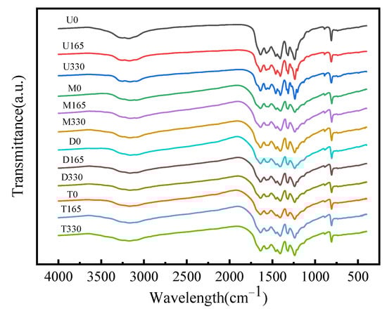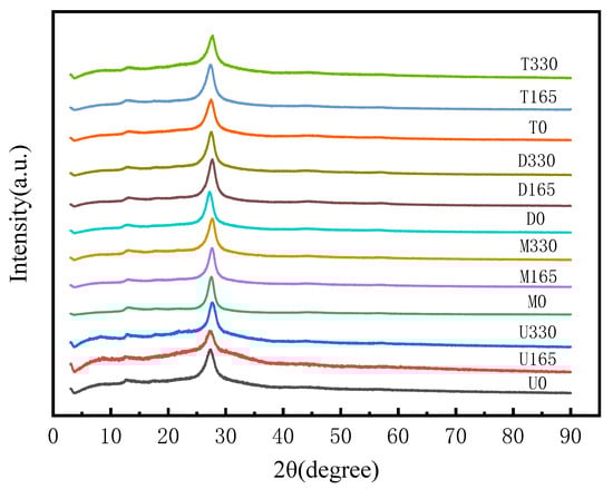 The XRD patterns of g-C3N4 samples synthesized from the four different precursors are shown in Figure 2. Two typical diffraction peaks were observed in the XRD patterns for all samples, indicating the successful synthesis of g-C3N4 by thermal oxidative etching of the four different precursors. A minor angle diffraction peak at 13.0° can be attributed to an in-planar structural packing, which corresponded to (100) crystal planes of g-C3N4, and the strong peak at 27.4° accorded with the repeated the inter-layer stacking of conjugated aromatic systems, which was indexed for graphitic materials as the (002) peak [49,50,51]. The XRD patterns of all samples did not have significant difference at 13.0°, corresponding to diffraction from (100) planes. Meanwhile, the interplane distance of all samples was around 0.68 nm, which is consistent with the other literature [52,53]. The XRD patterns of U0, M0, D0 and T0 showed diffraction peak intensity around 27.4°: M0 > D0 > T0 > U0, indicating the presence of smaller crystalline domains in U0, in line with the SEM observation. In addition, at the same peak positions, these patterns displayed a slight broadening width of the overall peaks following longer thermal oxidative etching time, indicating that the crystallinity of the g-C3N4 decreased at prolonging thermal oxidative etching time and more edge defects were thereupon made. Hence, the interlayer spacing of g-C3N4 material became larger, which is in good agreement with the phenomenon observed by SEM. The average crystallite size of all samples is shown in Table 1. The crystalline size of g-C3N4 that used urea as a precursor was the smallest, and the thermal oxidation etching time had no obvious effect on the crystalline size.