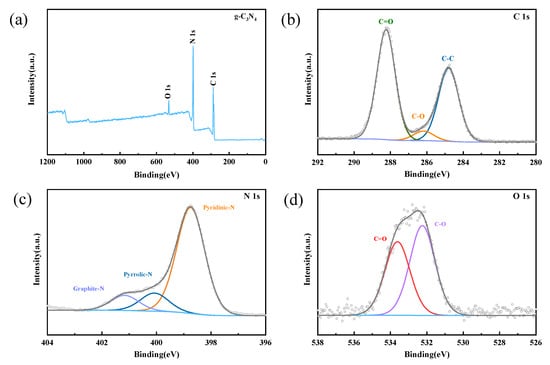 The surface morphologies and microstructure properties of the g-C3N4 samples were measured by a scanning electron microscope (SEM, FEI Quanta-PEG450, American FEI, USA). X-ray diffraction (XRD) patterns of the g-C3N4 samples were collected by an X-ray diffractometer (Rigaku UltimaIV, Japan), where the 2θ values of the obtained data ranged from 10 to 90◦ with Cu Kα irradiation. The photoluminescence (PL) properties of the g-C3N4 samples were measured using a F-98 system (Shanghai, China). XPS measurements were finished using a Thermo VG ESCALAB-250 (Thermo-VG Scientific, Waltham, MA, USA) under A1Kα (1486.6 eV) radiation. The FTIR spectrum was obtained with a PerkinElmer Spectrum Two spectrometer (PerkinElmer Instruments Co., Ltd., Waltham, MA, USA). The specific surface area was quantified using a multipoint Brunauer–Emmett–Teller (BET, Conta NOVE-1000 e, Quantachrome Instruments, USA). The UV–vis diffuse reflectance spectra (DRS) were obtained by a TU-1901 (Beijing, China) with a wavelength range of from 200 to 800 nm.