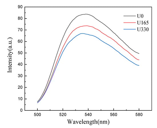 The PL emission spectra of g-C3N4 samples that used urea as a precursor were recorded in Figure 5. PL were used to understand the efficiency of trapping, migration, transfer and separation of charge carriers, and to investigate their lifetime in semiconductors, since PL emission results from the recombination of electron/hole pairs [69,70]. In general, a lower PL intensity suggests a lower recombination rate of the electron–hole pairs under light irradiation [71,72,73]. It can be seen from Figure 5 that all the samples show a broad PL emission spectra in the 500–580 nm region. In comparison, it can be observed that U330 exhibits the lowest emission intensity, which means that U330 is more efficient at promoting the separation of electron–hole pairs. This indicates that U330 is preferable in the case of utilizing the materials as catalysts in the photoreactions, and also suggests that the separation efficiency of photogenerated electrons and holes in urea-derived g-C3N4 samples increases with the extension of thermal etching time.