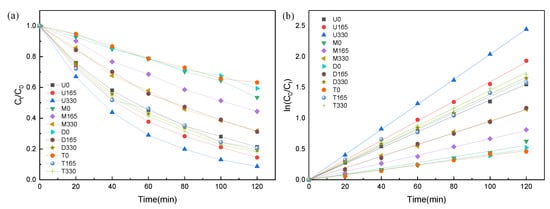 The photocatalytic degradation process can be transformed to pseudo-first-order kinetics (Equation (1)) through data fitting; thus, pseudo-first-order reaction kinetics (k) can be used to compare the photodegradation efficiency of photocatalyst samples under the same conditions [47,48]: