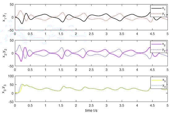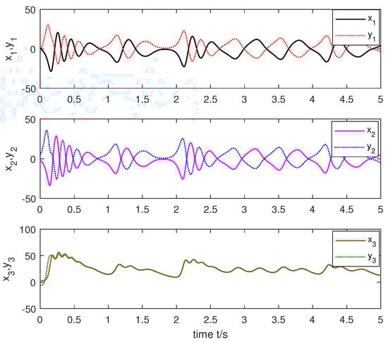 Especially, the simulation results are also given to illustrate the efficiency of the designed controller when is given a certain value. Figure 3, Figure 4 and Figure 5 show the CSAS phenomenon when (Lorenz system), (Lü system) and (Chen system). The simulation results show that even if the valve of is changed, the designed controller is also effective. It further shows that the controller we designed is a global controller.