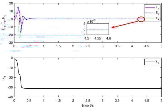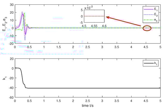Next, we give numerical simulations to illustrate the efficiency of the designed controller. The initial values are given as , , and . The simulation results are shown from Figure 1, Figure 2, Figure 3, Figure 4 and Figure 5.