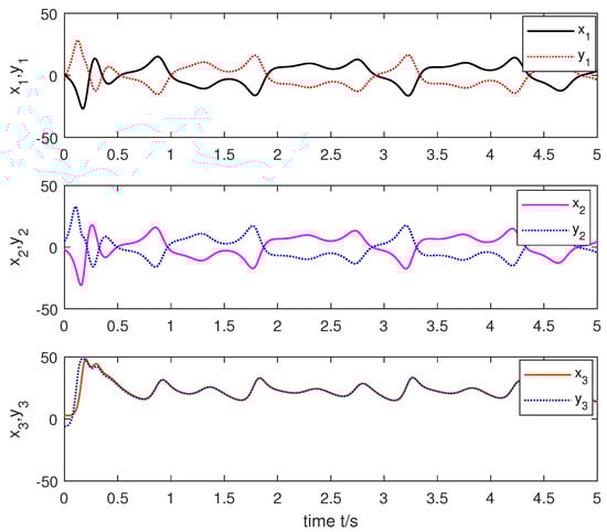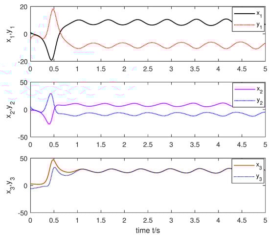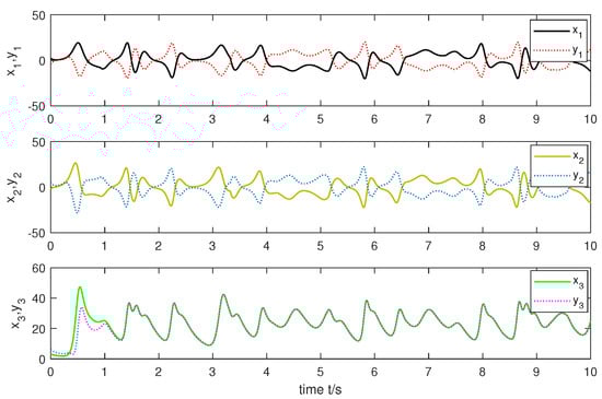 Due to , obviously, are the equilibrium of the uncontrolled master System (14) and the slave System (15) (i.e., ), which satisfy AssumptionA1. According to the nonlinear system control theory, there exists controller u, which can make sure the coexistence of synchronization and anti-synchronization for the master chaotic System (1) and slave chaotic System (2).