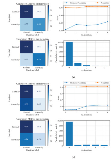 - The semi-supervised approach required an initial labeled dataset to label unlabeled samples as normal or anomalous. The percentage of anomalies in the initial labeled dataset closely matched reality, thanks to the deterministic method used and to DBSCAN. Hyperparameter tuning was performed on semi-supervised models. The tuner could test up to 180 models on 20 combinations of learning parameters. The BAS of the best model increased from 80.5% (first iteration of the self-learning process) to 86% (last iteration), which was deemed acceptable to automate HVAC FDD in non-residential buildings.