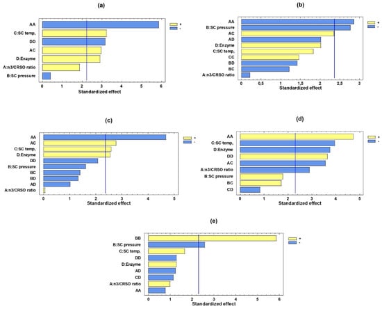 Effect of the n-3/CRSO ratio, SC temperature, SC pressure, and amount of enzyme on the SAcyl synthesis process. Standardized Pareto diagrams showing the influence of the independent variables on the response variables (the blue line indicates the p ˂ 0.05 confidence interval). Panels (a–e), represent EPA, DHA, EPA + DHA, PA, and EPA/DHA in sn-2, respectively.