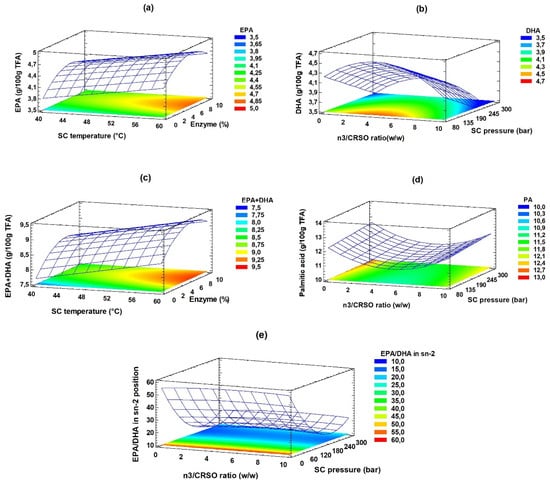 Effect of n-3/CRSO ratio, SC temperature, SC pressure, and amount of enzyme on the SAcyl synthesis process. Estimated response surface and contour response surface. Panels (a–e), represents EPA, DHA, EPA + DHA, PA, and EPA/DHA in sn-2, respectively.