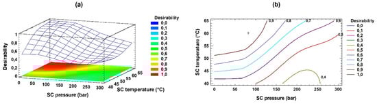 Response surface and contouring graphs showing the multi-response optimization of EPA, DHA, AP, EPA + DHA, and EPA/DHA in sn-2 (SC, supercritical conditions). Panels: (a) desirability function; (b) contours of estimated response surface.