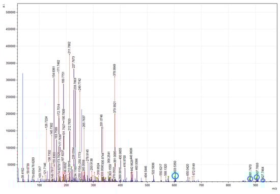 MALDI-TOF mMass report spectrum of glycerolipids profile obtained from CRSO, obtained between 100 and 900 m/z ratio values. The m/z ratio signals corresponding to MG, DG, and TG presenting EPA at the sn-2 position are marked in blue. Database: LIPID MAPS for glycerolipids.