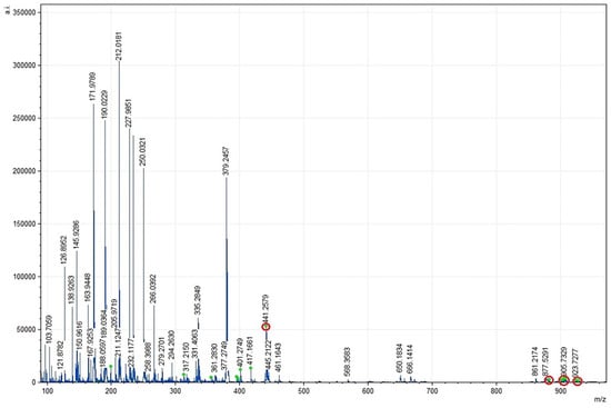 In general, the spectral mass ranges for EPAs and DHAs were found between 441.2402 and 927.8375 (m/z); in this range, both fatty acids were always visualized as part of TGs, except for DHAs, whose spectrum at 441.2402 (m/z) was related to the MGs (Figure 4 and Figure 5).