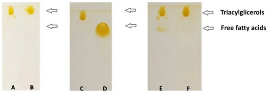 The identification of all samples was carried out by TLC on silica gel 60 F254 plates (Merck). For this, a mixture of chloroform, acetone, and glacial acetic acid (96/4/1, v/v/v, respectively) was used as the eluent [32]. The elution order on the chromatographic plate from bottom to top was evaluated according to their decreasing polarity: monoacylglycerols (MGs), diacylglycerols (DGs), and TG [17]. In order to visualize all lipid structures, the plates were stained with an iodine solution.