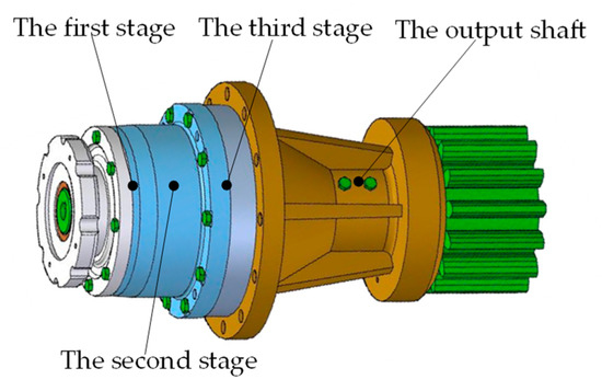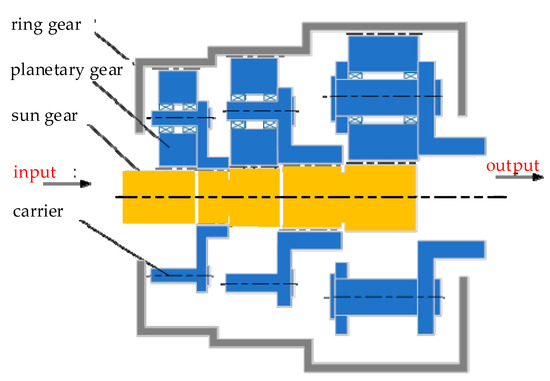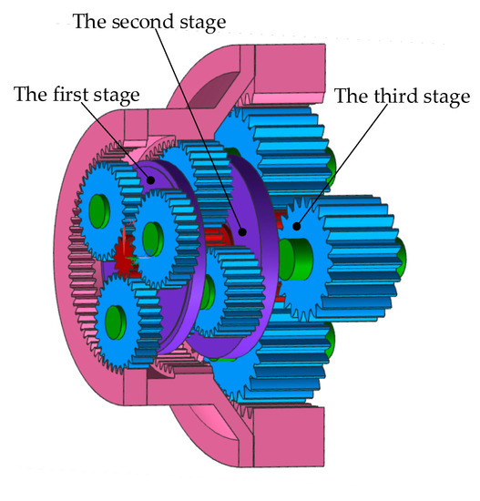 The example analyzed in this study is the pitch drive with a three-stage planetary gear system in a 2 MW wind turbine. The main function of the pitch drive serves as pitching and adjusting the output power of the wind turbine. Its parameters are listed in Table 2. There are three planetary gears equally placed in each stage, and the phase angle of first planetary gear is 2π/3.