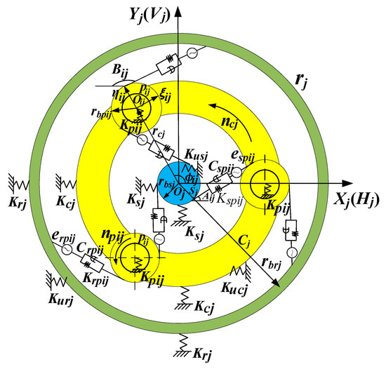In Figure 3, Ksj, Krj, Kpij and Kcj represent the support stiffness of the sun gear, ring gear, ith planetary gear and the carrier in jth stage, respectively, and Kusj, Kurj, Kucj are the rotational stiffness of the sun gear, the ring gear and carrier, respectively. The meshing between the sun gear and the planetary gear is defined as external meshing, and that between the ring gear and the planetary gear is defined as internal meshing. Kspij and Krpij are the stiffness of the external meshing and the internal meshing, respectively. Cspij and Crpij are the damping of the external meshing and the internal meshing, respectively. espij and erpij are the equivalent error of the external meshing and the internal meshing, respectively. upij, usj and ucj are the rotational displacement of the planetary gear, the sun gear and the carrier in the jth stage, respectively. usj = rbsj × θsj, upij = rbpij × θpij, and ucj = rcj × θcj.